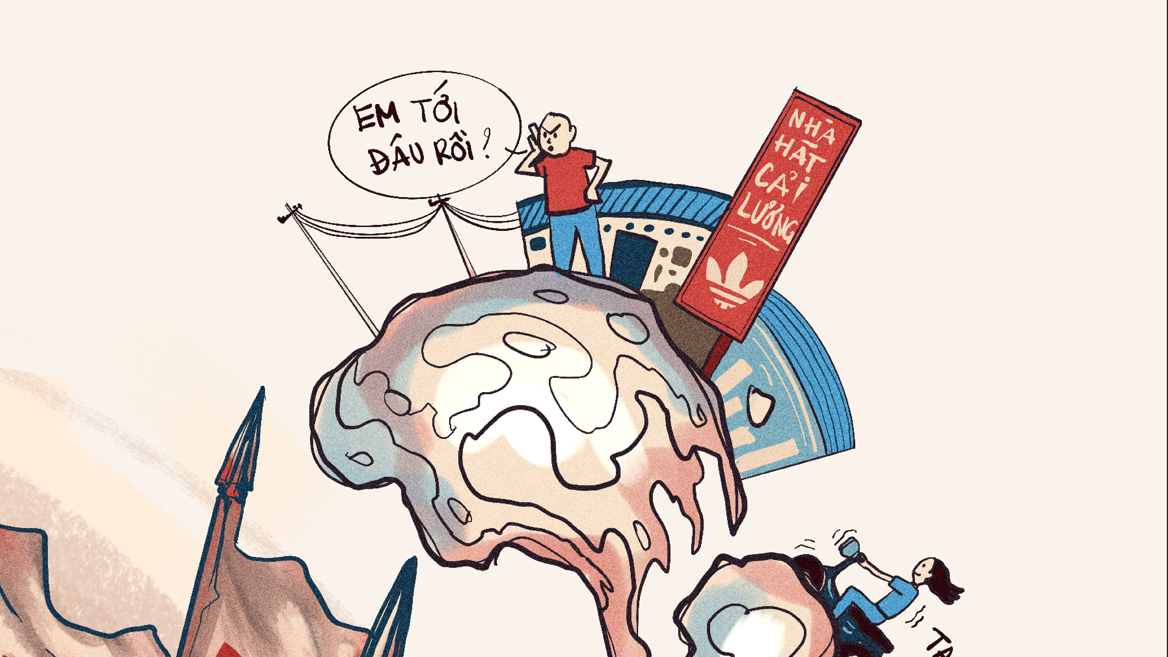 And there are still many young artists who are working hard to keep Tân Cổ, and many other traditional art forms... popular with the public. They are the inspiration for this work: a "main actor" who throws himself through noisy, bustling, crowded streets... like a real track athlete, on a pair of legendary adidas Samba shoes... to get to the stage, to the audience. The person who lent his voice for the recording that you can hear in the clip is such a character: artist Minh Truong - winner of Chuong Vang Vong Co 2014.